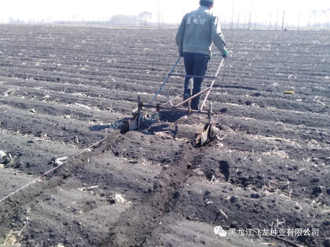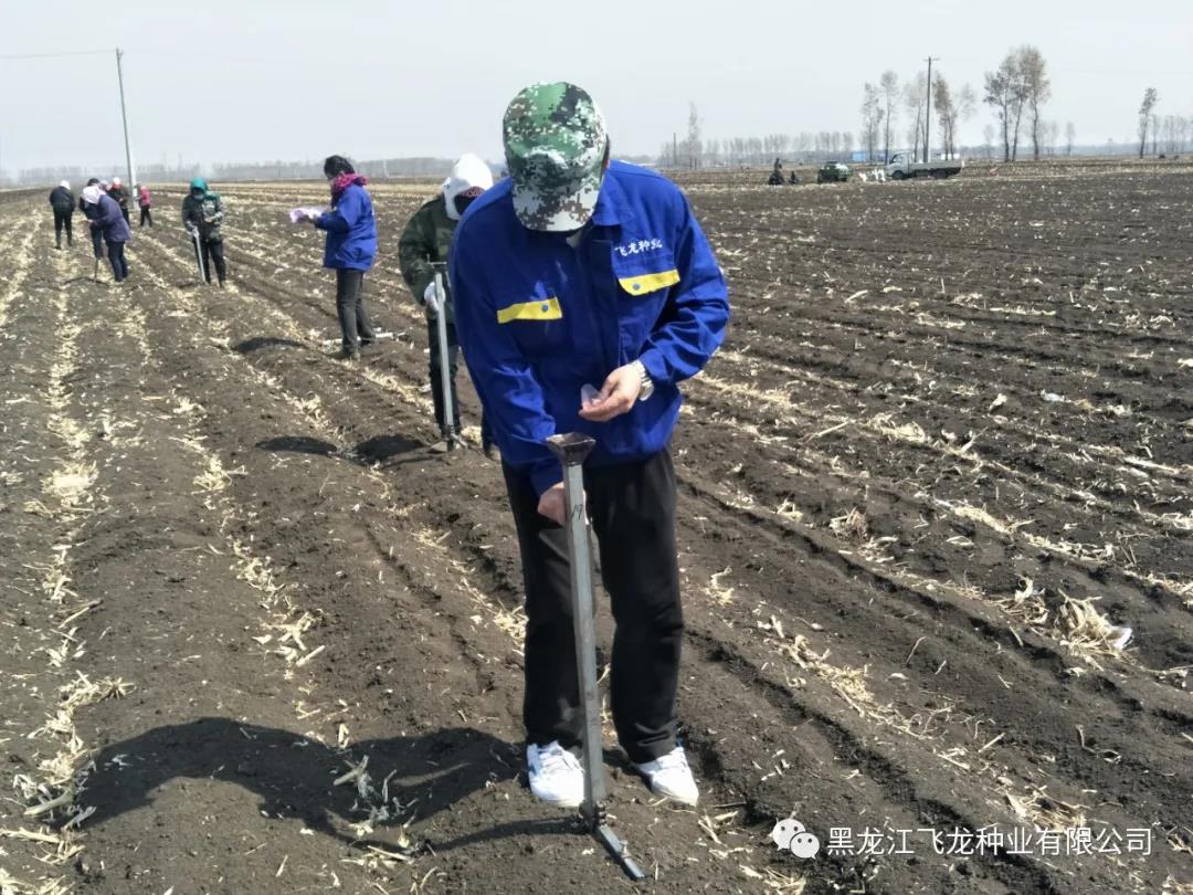 飛龍種業(yè)科研育種基地主要采用人工播種。播種前,科研人員根據(jù)播種需求調(diào)好自制播種器的尺寸。播種時(shí),手持播種器插入壟臺(tái)正中,每次投放兩粒種子,再用腳踩實(shí)即可。
